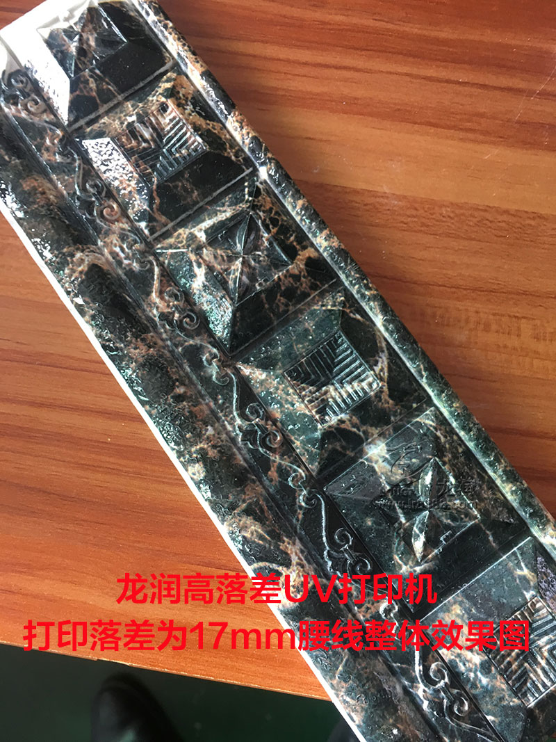 我們隨機(jī)抽取了一塊樣品進(jìn)行打印,打印出來后整體效果還算滿意,客戶也能認(rèn)可,然而我們那尺子測(cè)量該腰線的落差高度,才知道該腰線落差高度已經(jīng)達(dá)到了17mm,比我們之前測(cè)試的15mm樣品還要高2mm,然而看細(xì)節(jié),發(fā)虛并不嚴(yán)重,也沒有嚴(yán)重飛墨的情況出現(xiàn),整體效果已經(jīng)是能達(dá)到客戶的需求。